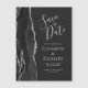 This elegant modern save the date magnet card features a black watercolor agate border trimmed with faux silver glitter. The customisable text is light silver grey on a dark charcoal grey background.