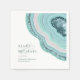 Not all wedding designs are created equal. The asymmetrical layouts for some of the pieces in this striking wedding set prove that's a good thing!. The coordinating wedding paper napkin shown here features a corner accent with wavy bands of colour in contrasting shades of teal blue and blush pink around a glittering crystal effect to forming a geode/agate. Easily add your names, wedding date and personal 'thank you' message using the provided template. Search ID647 to see all the coordinating pieces in this set.