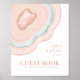 Not all wedding designs are created equal. The asymmetrical layouts for the pieces in this striking wedding set prove that's not a bad thing! Wavy bands of color in contrasting shades of rose gold blush and soft teal blue with a center of glittering crystal form a geode/agate accent on most pieces in the set. The wedding 'Guest Book' sign shown here features the above plus a template to add a personal message, your names and wedding date. Search ID647 to see all the coordinating pieces in this set.