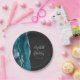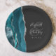 These elegant modern wedding plates feature a teal watercolor design trimmed with faux silver glitter. Easily customise the silver grey text on a dark off-black background, with the names of the bride and groom in handwriting calligraphy over a large ampersand.