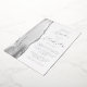 The left-hand edge of this elegant modern wedding invitation features a gray watercolor agate border trimmed with faux silver glitter. The customizable text combines script and sans serif fonts in real silver foil on a white background. The reverse side features a matching agate design.