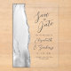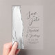 The left-hand edge of this elegant modern wedding save the date card features a grey and white watercolor agate border trimmed with faux silver glitter. The customisable text combines charcoal grey handwriting, copperplate and italic fonts on a clear transparent background.