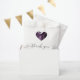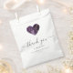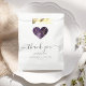 These elegant modern wedding favour bags feature a heart shape filled with a purple watercolor agate and faux gold glitter design. The words "thank you" appear in elegant charcoal grey handwriting script with swashes at the beginning and end. Customise the message and add the names of the couple and wedding date.