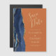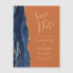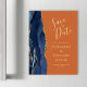 This elegant modern save the date magnet card features a navy blue watercolor agate border trimmed with faux gold glitter. Easily customise the gold-coloured text on a burnt orange background.