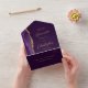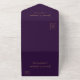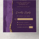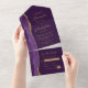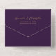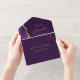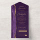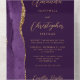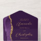 The left-hand edge of this elegant modern all-in-one wedding invitation and RSVP features a purple watercolor agate border trimmed with faux gold glitter. The customisable text combines gold-coloured stylish calligraphy script and sans serif fonts on a plum background. The return address appears on the outside flap and the reverse side of the detachable RSVP card in gold-coloured text on solid plum.