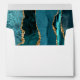 The inside of this elegant modern wedding invitation envelope features a teal blue watercolor agate design trimmed with faux gold glitter. Customise the back flap with the couple's names in stylish charcoal grey handwriting script and the return address in sans serif font on a white background.