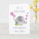 Funny birthday card, titled "Age is irrelephant". Design features a whimsical illustration of a cute elephant with birthday balloons, love hearts and flowers. You can personalise the card for anyone you want on the front and you can also write your own message inside.