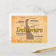 Aged antique paper Delaware state pride image including map silhouette with cities, towns and nickname.