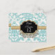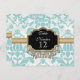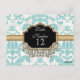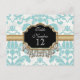 NOTE: This is a flat printed postcard table number card. It's glossy on one side, matte on the other. There are no raised layers or actual metal or jewels in it. This is a graphically designed image that looks quite real, but is flat. If you are DIY handy, you could easily add real jewels, crystals or glitter to this design. COLOR PALETTE: off white, aqua blue, black and gold metallic look. DESIGN COLLECTION: This is a truly elegant and sophisticated Couple's Bridal Shower Invitation Collection with a formal modern vintage flair! Shown here in creamy white on aqua blue, the invitation has an elegant dramatic dimensional appearance. For a beautiful finishing touch select the matching invitation envelope of the same design. This is artwork designed by Audrey Jeanne Roberts created from antique vintage look worn damask patterns, a beautiful frame with diamond look "jewels" dangling from it and layered over a gilded look ribbon. There are RSVP response cards, Reception Invitations, Wedding Program, Driving instructions, Hotel Accommodation cards, postage, stickers and more available to match. If there's a product you would like to have created that isn't offered just message us!