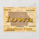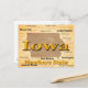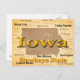 Aged antique paper Iowa state pride image including map silhouette with cities, towns and nickname.