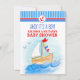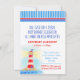 Nautical theme bright blue and red baby shower invitation. Cute sail boat whimsical art on front and lighthouse watercolor art on the reverse in joyful and bright blue, red and white. Personalise with your own party details. Original hand watercolor whimsical paintings and design by Sarah Trett for www.mylittleeden.com only on Zazzle.