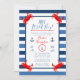 Turning to the back of the invitation, the blue and white stripes continue in a clean and crisp pattern, while a single cartoon crab in the centre provides a delightful focal point. This simple yet effective design choice ties the invitation together seamlessly and reinforces the playful nautical theme throughout.
