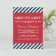 A modern red, white and blue baby shower invitation. It has a white and blue diagonal stripes pattern background and a red frame. This party invitation is perfect for nautical and ocean themed parties.