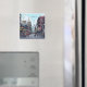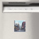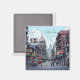 Comic book style ai illustration of downtown area of Kolkata, India architecture, motor bikes and cars. A magnet with an illustration of busy downtown street with buildings, restaurants, shops and people on their motor bikes.