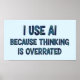 Make a statement with this poster that reads: "I Use AI Because Thinking is Overrated." Perfect for home offices, dorm rooms, or techy workspaces, it’s a humorous nod to the modern world of AI and automation. Ideal for AI enthusiasts, tech lovers, or anyone who appreciates a clever joke.