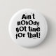 Funny slogan text design button with the phrase Ain't Nobody Got Time For That. Add additional text to give this design a personal touch.