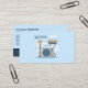 A business card for an air conditioning repair service for technician, installation or maintenance services, repair company or selling household equipment in the field of air conditioning or HVAC. It comes with an illustration of a wrench, a fan and an air conditioning unit on a light blue background with white lines representing air. The reverse side provides complete contact information and a list of services.
