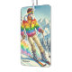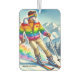 A cute picture of an LGBT male presenting individual, skiing with pride down the slopes, whilst flicking up rainbow snow.