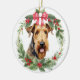 This pretty Holiday ornament features a beautiful portrait of an Airedale Terrier Dog. The dog is framed with a holly and red berries wreath, with a bright red bow at the top. The back of the ornament has the same red bow wreath, with two text fields for you to customise.