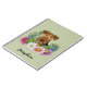 Destei's original cartoon illustration of a cute Airedale Terrier breed dog's head close-up surrounded by colourful summer wildflowers. There is a blush pink flower, a purple flower, a dark pink flower and a white daisy flower together with some green leaves and branches. The background colour is green with a light polka dot pattern. The background colour can be changed to any other colour and the polka dot pattern can be removed, if so wished. There is also a personalizable text area for a name or other custom text.