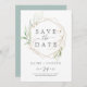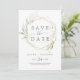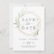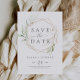 This airy greenery save the date announcement card is perfect for a modern wedding. The elegant botanical design features light and airy watercolor eucalyptus accented with whimsical gold glitter leaves.