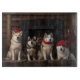 An enchanting scene captures the essence of cosiness and holiday spirit as furry companions adorned in Santa Claus hats gather around a crackling fireplace. The warmth emanating from the hearth creates a snug atmosphere for these adorable canines, while festive stockings hang in the background, enhancing the merry ambiance. The charming illustration portrays a timeless image of companionship and festive joy, perfect for celebrating the holiday season with a touch of canine charm.