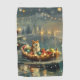Set sail into the magic of the holiday season with this beautifully detailed illustration, showcasing a proud dog sitting in a festively decorated boat, gliding across a serene Christmas lake. The twinkling lights from nearby pine trees reflect off the water, casting a warm, festive glow that enhances the cosy ambiance. Ornaments dangle from the boat's sides, while glowing lanterns light the way, creating a scene that captures the true essence of Christmas warmth and joy. This nostalgic artwork brings a touch of holiday magic to any space, perfect for those who cherish the spirit of the season.