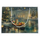 Set sail into the magic of the holiday season with this beautifully detailed illustration, showcasing a proud dog sitting in a festively decorated boat, gliding across a serene Christmas lake. The twinkling lights from nearby pine trees reflect off the water, casting a warm, festive glow that enhances the cosy ambiance. Ornaments dangle from the boat's sides, while glowing lanterns light the way, creating a scene that captures the true essence of Christmas warmth and joy. This nostalgic artwork brings a touch of holiday magic to any space, perfect for those who cherish the spirit of the season.