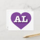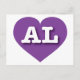 This postcard features a vibrant purple heart containing the bold, white, upper case letters AL, the official abbreviation for Alabama, the yellowhammer state. The reverse side of the postcard is blank, awaiting your handwritten sentiments or customised text.