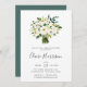 Elegant floral graduation party invitations feature a bouquet of watercolor white roses and peonies with lush green botanical foliage and leaves. Personalise with your graduation party details beneath in a chic mix of block, serif and calligraphy typefaces.