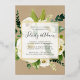 Elegant and modern floral engagement party invitation features a background of ivory roses and peonies with lush green botanicals and foliage with real gold foil trim. Your engagement party details are overlaid on a sheer white element in elegant inky off-black lettering accented with handwritten style calligraphy. A speckled brown kraft background adds rustic charm.