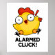 Alarmed Cluck Funny Chicken Clock Pun features a shocked chicken letting out an alarmed cluck! Perfect pun gift for family and friends who love cute alarming chicken puns.
