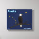 A Bald Eagle (Haliaeetus albicilla) scans the sky from his perch on a tree branch; superimposed on a flag of Alaska. Text reading "Alaska" also appears in glowing blue and white. Add your own additional text.