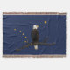 A Bald Eagle scans the sky from his perch on a tree branch; superimposed on a flag of Alaska.