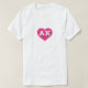This shirt features a vibrant hot pink heart containing the bold, white, upper case letters AK, the official abbreviation for Alaska, the last frontier.
