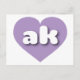 This postcard features a mellow lavender heart containing the bold, white, rounded, lower case letters ak, a playful abbreviation for Alaska, the frontier state. The reverse side of the postcard is blank awaiting your customised text or handwritten sentiments.