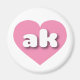 This magnet features a vibrant pink heart containing the bold, white, rounded, lower case letters ak, a playful abbreviation for Alaska, the last frontier.