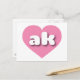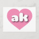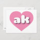This postcard features a vibrant pink heart containing the bold, white, rounded, lower case letters ak, a playful abbreviation for the state of Alaska.