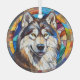 Here's a pretty glass ornament with a stained glass theme, featuring a beautiful Alaskan Malamute dog. The dog is set against a multi colour mosaic background. Colours include blue, gold, maroon red, and more. This makes a nice stocking stuffer or decoration for the household who loves a majestic Malamute.