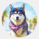 Alaskan Malamute on Beach, summer gift Classic Round Sticker