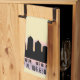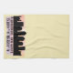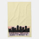 Stylish kichen towel features an Albuquerque NM city skyline silhouette and map coordinates with a watercolor splash background.