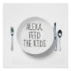Humorous command for the Alexa device to feed kids on a white dinner plate, isolated against a white background. The text on the plate is editable, and the background color can be changed.