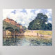 Alfred Sisley. Hampton Court Bridge. Summer landscape. Numerous boats standing on the river bank. A beautiful arched bridge spans the river. There are competitions on the river. Kayak paddlers float out from under the spans of the bridge. There are big beautiful green trees and houses in the background. Reproduction of famous works of art images in the public domain.