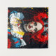 Imagining Alice as the Red Queen fantasy AI generated art in the colours of red,blue,yellow, black and white with ink splatters.