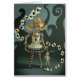 This Alice In Wonderland Picture Fairy Tale Painting is a whimsical illustration of a little girl wearing an Alice in Wonderland Costume and holding a bunny by the ear. I call this interpretation Miss Wonderland. The background is blue green and contains swirly shapes. Cards spiral around her. One of my favourite fairy tales is Alice in Wonderland.