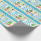 Cute Alice in Wonderland blue and yellow striped wrapping paper for a book themed birthday. Little girl Alice in her blue dress and the Mad Hatter sit next to your custom HAPPY BIRTHDAY message for a bookworm birthday girl.