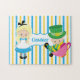 Cute Alice in Wonderland jigsaw puzzle for a book themed birthday. Little girl Alice in her blue dress and the Mad Hatter sit on pretty blue and yellow whimsical stripes. Customize with your own text.