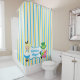Cute Alice in Wonderland shower curtain with a fun childrens book theme. Little girl Alice in her blue dress and the Mad Hatter sit on pretty blue yellow striped bathroom decor. Customise this whimsical bath accessory with your child's name.