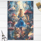 A whimsical decoupage design featuring Alice walking along a woodland path lined with red cap mushrooms, capturing the magical charm of Wonderland.
