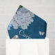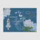Alice in Wonderland with the quotation from the book, Curiouser and curiouser, cried Alice, with butterflies, beautiful blue and white hydrangeas, a vintage pocket watch, and writng and postmarks from an old French letter are set on a deep cobalt navy blue background with pretty handwriting and text from a vintage French shop receipt to make a pretty, nostalgic floral French literary themed tissue paper for gift wrapping or decoupage and crafts.